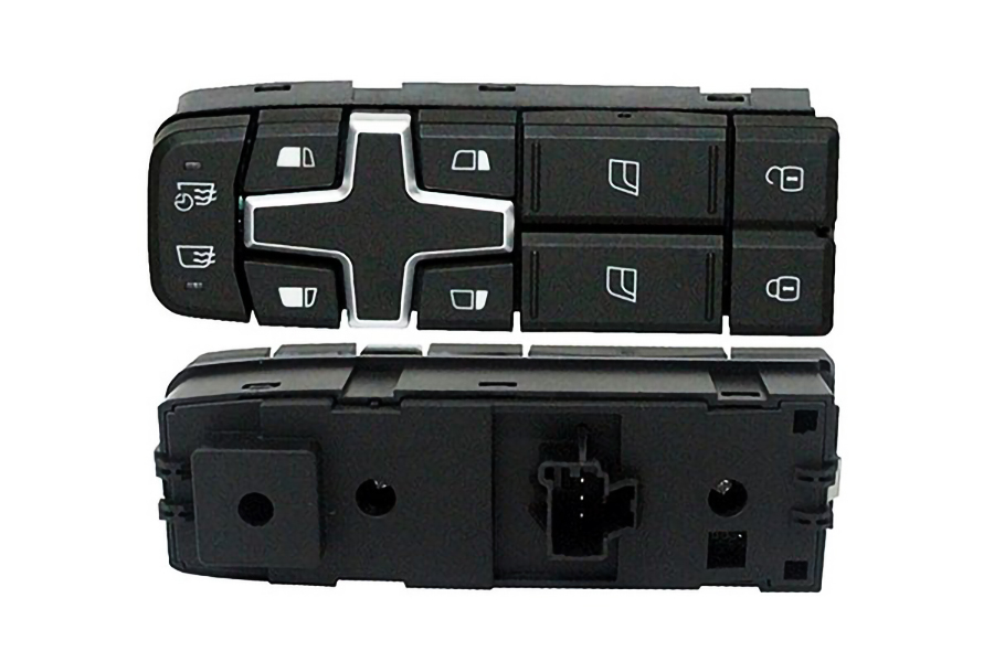 Botão completo para acionamento do vidro elétrico do lado esquerdo, indicado para caminhões Volvo das famílias FH e FM fabricados a partir de 2015. Este componente é responsável pelo controle do movimento do vidro, garantindo operação precisa e confiável.