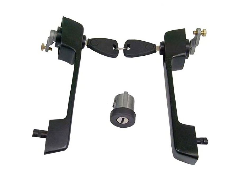 Conjunto composto por macanetas esquerda e direita acompanhadas do cilindro de ignição, indicado para uso em caminhões com cabine dos modelos 331-1518, 2217, 2219, 1814, 1318 e 1113.