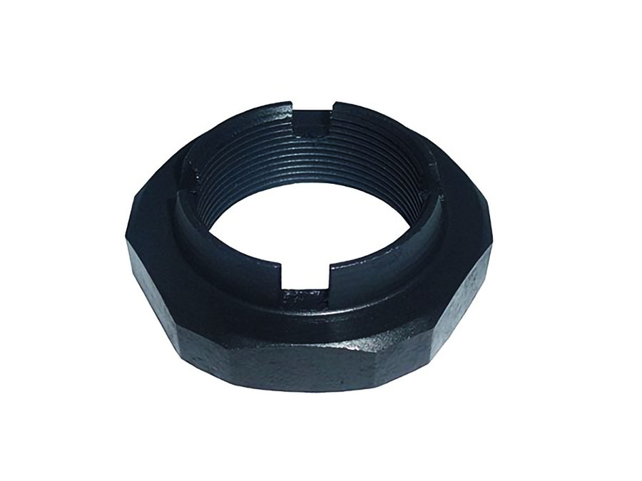 Porca castelo projetada para fixação do pino da manga do eixo em veículos comerciais das famílias Volvo FH, NH, FM e VM. Esta peça é essencial para garantir a segurança e o correto funcionamento do conjunto do eixo, mantendo a integridade estrutural durante a operação do caminhão.