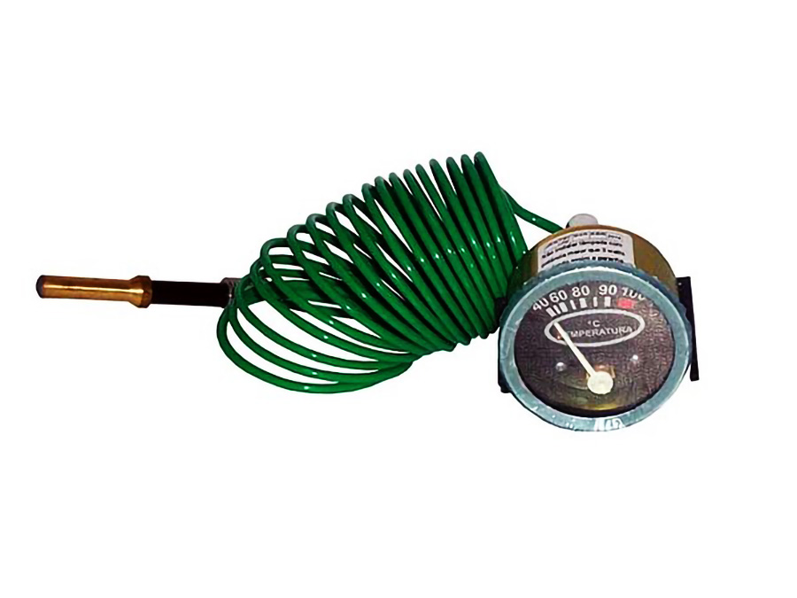 Relógio de temperatura com formato redondo, equipado com cabo de 4 metros, indicado para monitoramento de temperatura entre 40 e 100 graus Celsius. Compatível com veículos comerciais das famílias Mercedes 321 e 1111 USA BR 4118. O instrumento oferece leitura precisa e confiável para controle térmico em sistemas automotivos.
